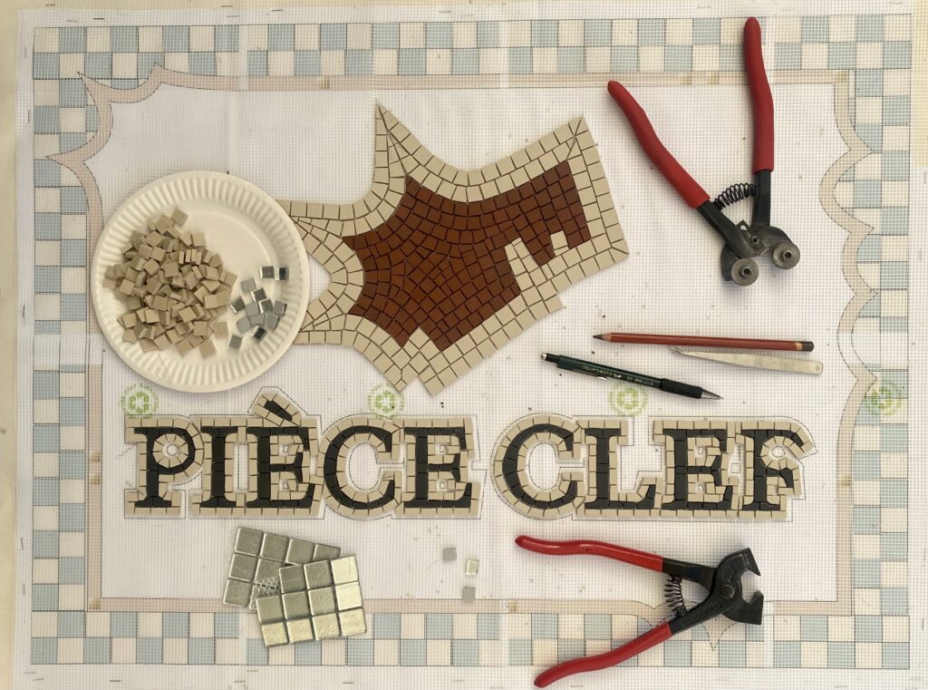 La mosaïque est produite à la main en atelier sur un filet . Elle est ensuite découpée en plaques pour faciliter la livraison sur le chantier.